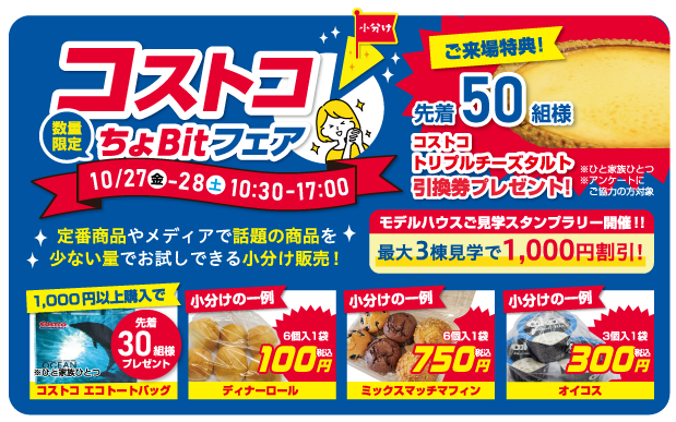 今月は先着50名様にコストコトリプルチーズタルト引換券をプレゼント!! さらに、モデルハウスを見学すれば最大3棟で1000円割引のスタンプラリーも開催中!