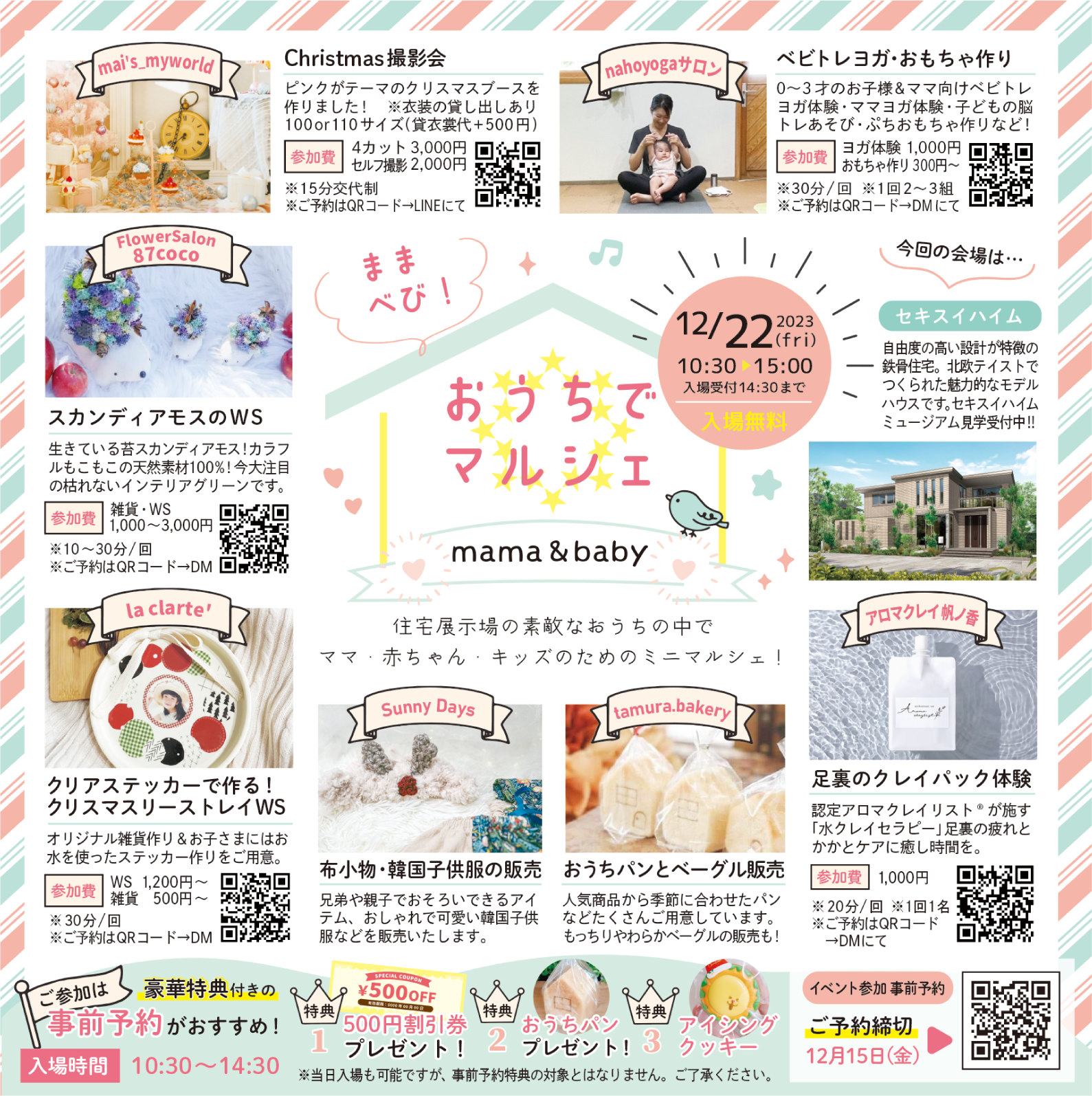 | その他 | 素敵なモデルハウスの中で、 ママ・赤ちゃん・キッズのためのミニマルシェ♡ 【ご参加は豪華特典付きの事前予約がおすすめ!】 【申し込み締め切り】 12/15(金)まで |