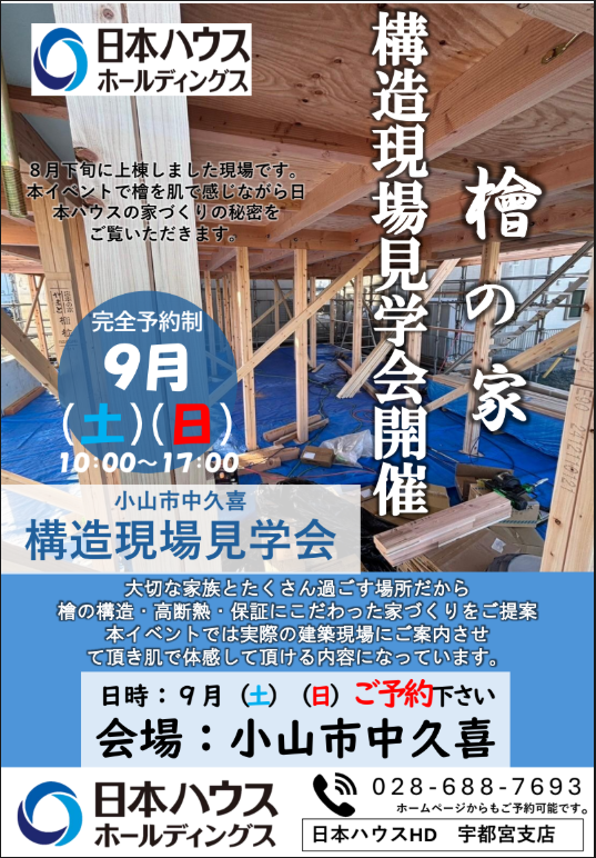 中々見れない家づくりの現場を日本ハウスでは皆さんに檜の良さを肌で感じながら家づくりの様子をご覧いただけます!イベントにご参加いただく方は、公式HPよりご来場予約、またはお電話にてご連絡ください。